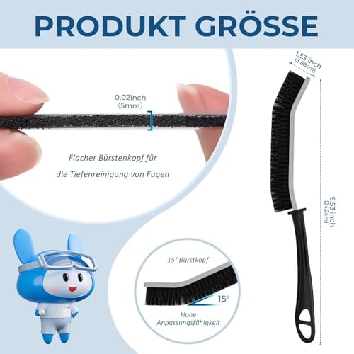 Ein besonders hervorzuhebendes Merkmal ist der rutschfeste, ergonomische Griff, der eine angenehme Handhabung ermöglicht. Die durchdachte Form sorgt dafür, dass Sie auch in engen Ecken problemlos reinigen können. Der schmale Bürstenkopf, der um 15° geneigt ist, in Kombination mit dicken Borsten, erleichtert das Erreichen von Fugen und Fensterrahmen. Selbst schwer zugängliche Stellen werden mit Leichtigkeit erreicht, ohne dabei zusätzlicher Kraftaufwand erforderlich zu sein.