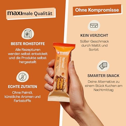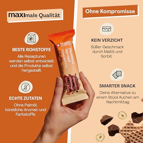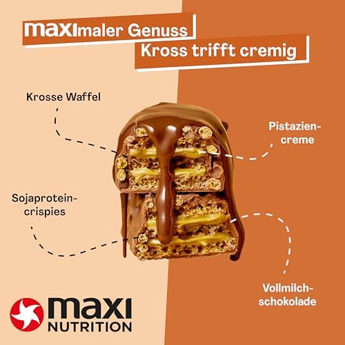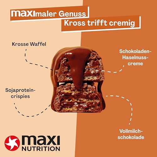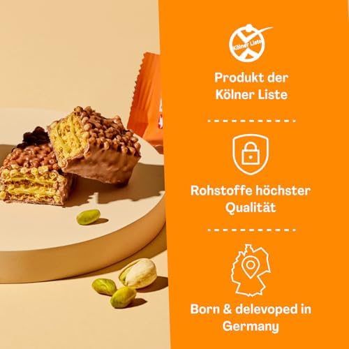 Erleben Sie eine exquisite Geschmackskombination aus knusprigen Waffeln, knackigen Crispies und einer cremigen Protein-Schokoladen-Haselnusscreme. Jeder Biss bietet einen harmonischen Mix aus Texturen und Aromen, die nicht nur ersatzweise Genuss bieten, sondern auch Ihr Verlangen nach Süßem stillen.