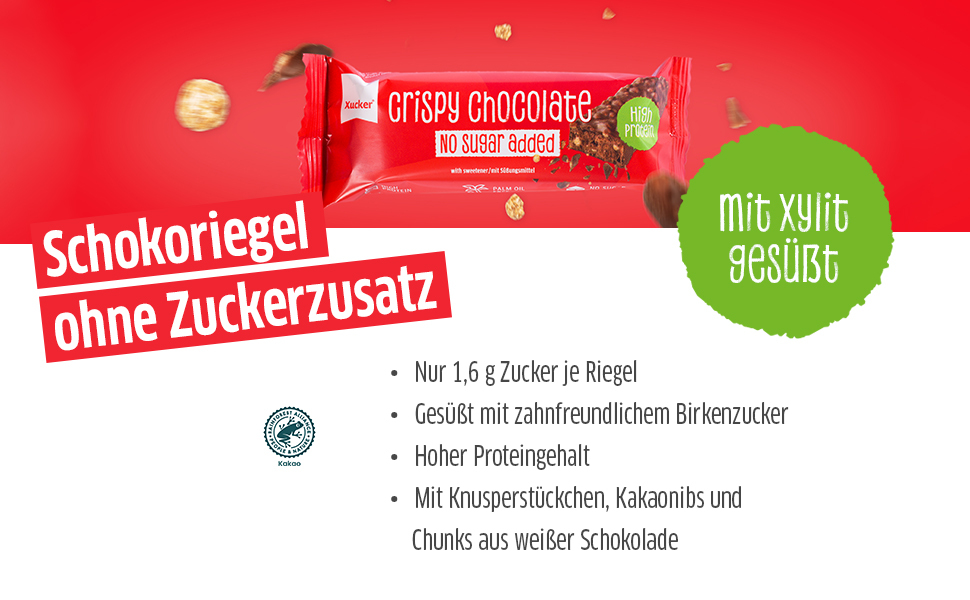 Entdecke den unwiderstehlichen Geschmack des XUCKER Crispy Chocolate Fitness Riegels! Diese proteinreiche Versuchung kombiniert knusprige Elemente mit einem zarten Schokoladenüberzug. Unter der köstlichen Schokoladenschicht verstecken sich herrliche Knusperstückchen, Kakaonibs und Stückchen aus weißer Schokolade – ideal für alle, die beim Snacken nicht auf Geschmack verzichten möchten.