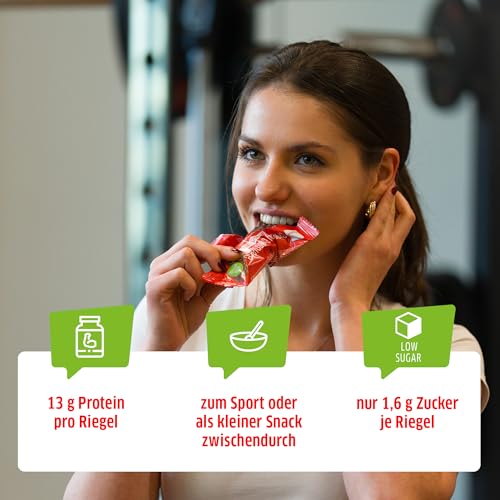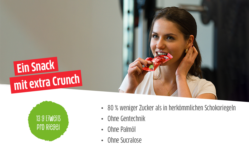 Unser Eiweißriegel bietet dir 13 g hochwertiges Protein und erfüllt höchste Qualitätsstandards. Hergestellt in Deutschland mit Rainforest Alliance-zertifiziertem Kakao, garantiert der Riegel ein reines Geschmackserlebnis ohne Palmöl, zugesetzten Zucker oder künstliche Süßstoffe. Damit kannst du deinen Zuckerkonsum reduzieren und gleichzeitig den Genuss voll auskosten.